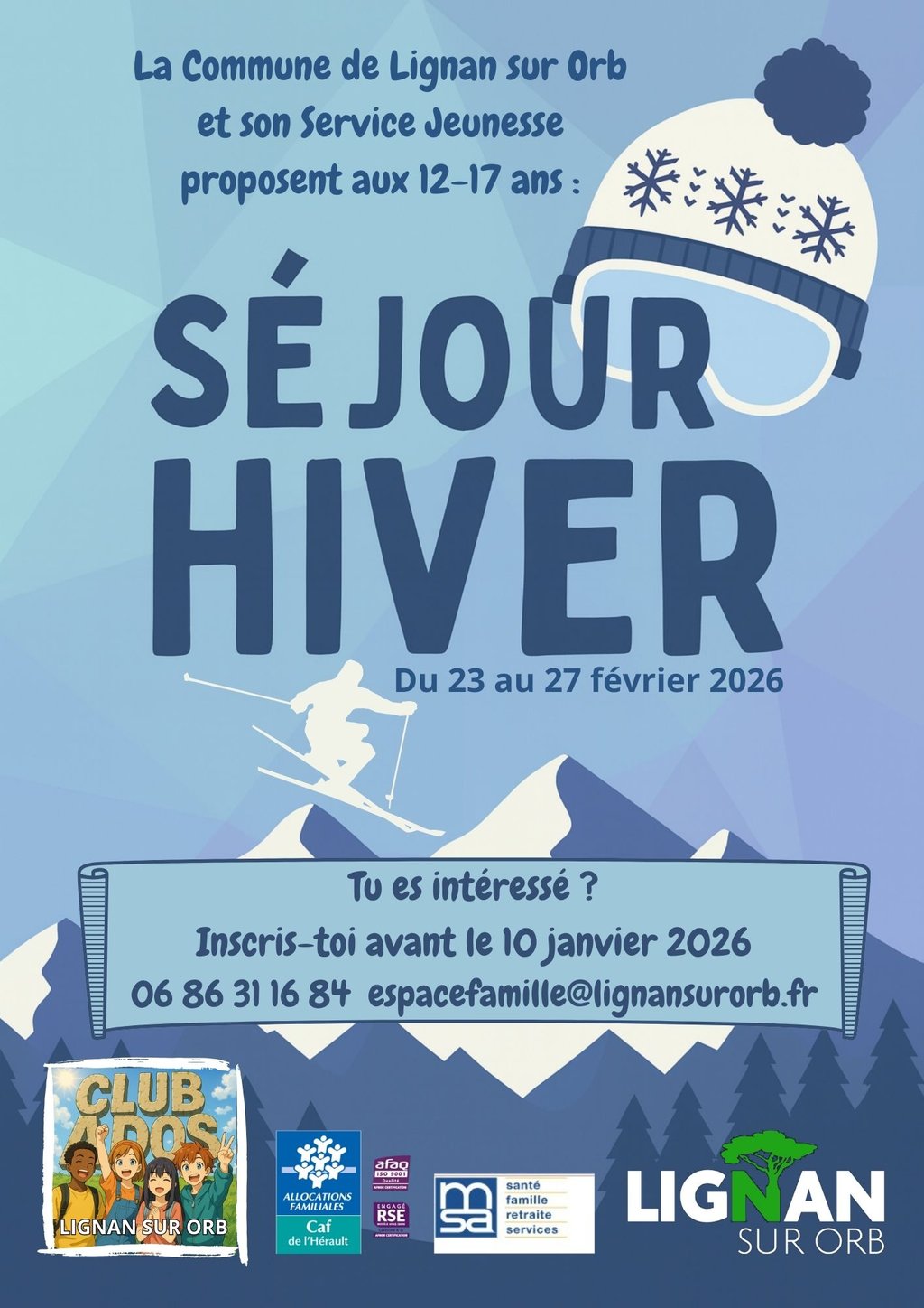La Municipalité de Lignan sur Orb et son Service Jeunesse ont le plaisir de proposer un séjour inoubliable à la montagne pendant les vacances d'hiver !