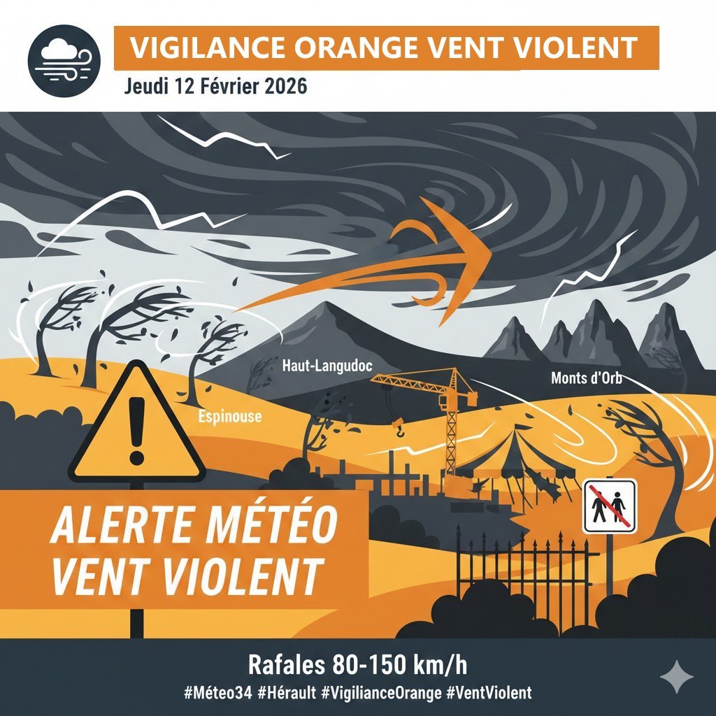 Météo France a placé le département de l’Hérault en vigilance orange pour "vent violent" ce jeudi 12 février 2026, à partir de 04h00. Une atténuation est attendue seulement en soirée.